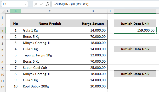 =SUM(UNIQUE(D3:D12)) → menghasilkan 159.000