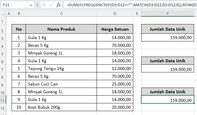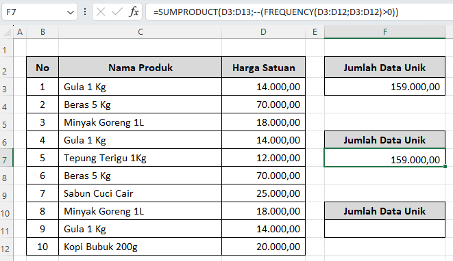 >0menghasilkan nilai TRUE/FALSE, yang kemudian dikonversi menjadi 1/0 oleh tanda ganda minus--. SUMPRODUCT(D3:D12; … )kemudian mengalikan setiap harga dengan hasil uji uniknya:- Jika nilai itu unik (TRUE → 1), harga dikalikan 1 → ikut dijumlah.