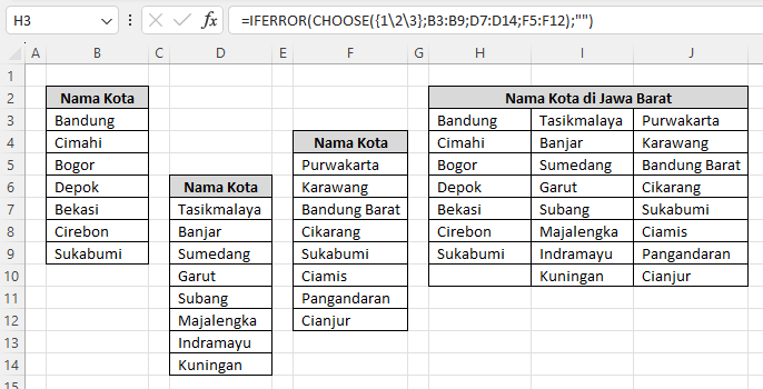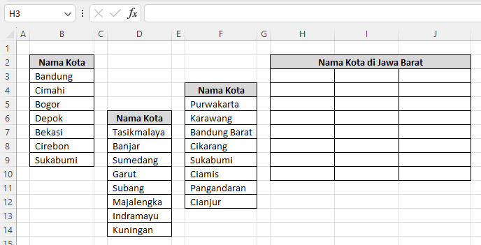 Misalnya kita punya tiga daftar nama kota Jawa Barat yang ditulis di kolom berbeda: