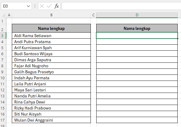Misalkan kita memiliki daftar nama berikut di kolom B: