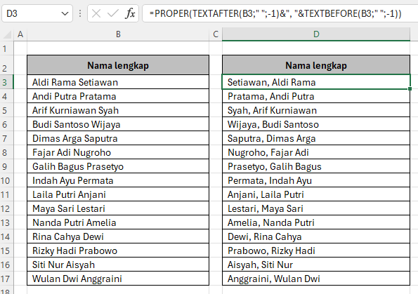 - TEXTAFTER(B3;” “;-1) → mengambil teks setelah spasi terakhir, yaitu nama belakang.