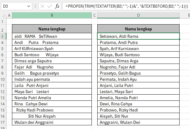Jika diterapkan pada rumus meletakkan nama belakang di depan, hasilnya akan tetap rapi meski data sumber berantakan.