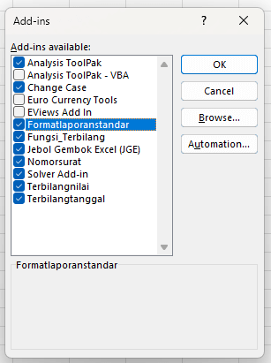 - Aktifkan: Pastikan checkbox di samping nama add-ins Anda tercentang. Klik OK.