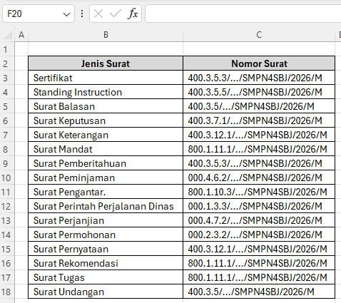 Dengan cara ini, cara membuat nomor surat otomatis di Excel menjadi fleksibel. Jika jenis surat diubah, kode surat akan langsung menyesuaikan.