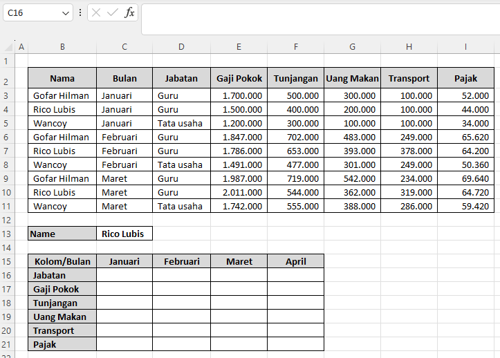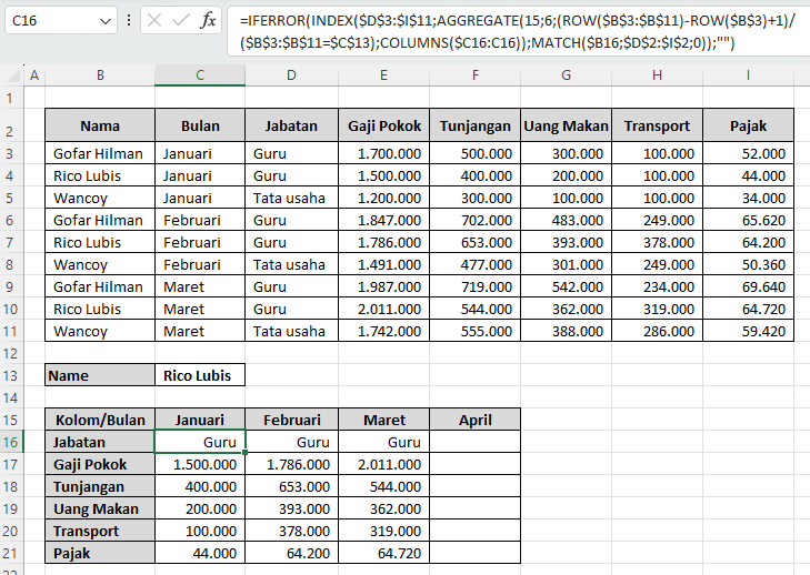MATCH digunakan untuk mencocokkan kategori data (misalnya Gaji Pokok, Tunjangan, dll) yang ada di sel B16 dengan header tabel di baris ke-2. - INDEX(…)
