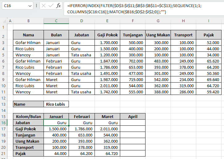 Bagian ini mengambil data dari kolom D sampai I, tetapi hanya baris yang sesuai dengan nama karyawan di sel C13. Misalnya C13 berisi Rico Lubis, maka hanya baris Rico Lubis yang akan ditampilkan. - SEQUENCE(1;1;COLUMNS($C16:C16))