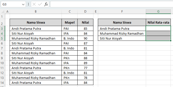 Keduanya sama-sama dapat digunakan untuk mencari nilai rata-rata per siswa, hanya saja ada sedikit perbedaan cara kerja. Mari kita bahas satu per satu.
