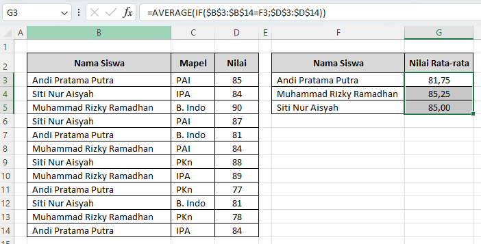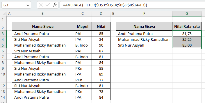 Jika sel F3 berisi “Andi Pratama Putra”, maka FILTER akan mengambil semua nilai Andi, yaitu 85, 81, 77, dan 84. Kemudian AVERAGE menghitung rata-rata: