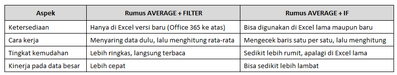 1. AVERAGE + FILTER → lebih modern, ringkas, dan cocok untuk Excel versi terbaru.