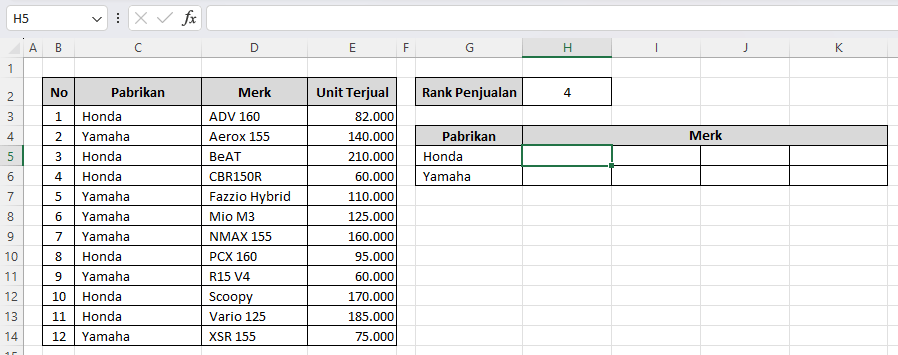 - Sel \$H\$2 berisi angka jumlah peringkat yang ingin ditampilkan. Misalnya, jika kita tulis 4 di H2, maka Excel akan menampilkan 4 motor terlaris 2025 dari pabrikan tersebut.