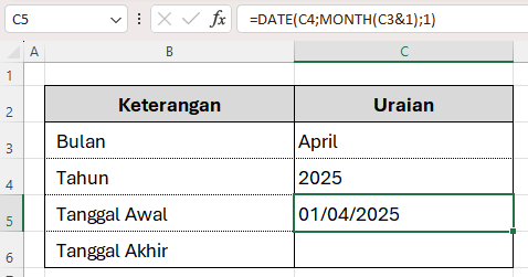 =DATE(C4;MONTH(C3&1);1) - Tanggal Akhir: