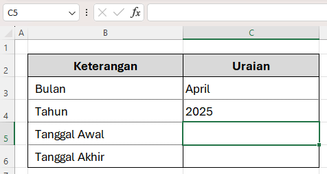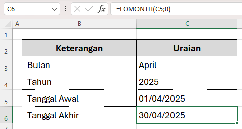 Tabel ini menunjukkan bahwa ketika kita mengetikkan bulan “April” dan tahun “2025”, maka Excel akan secara otomatis menampilkan tanggal awal bulan 1 April 2025 dan tanggal akhir bulan 30 April 2025.