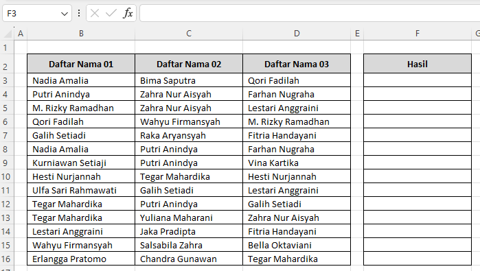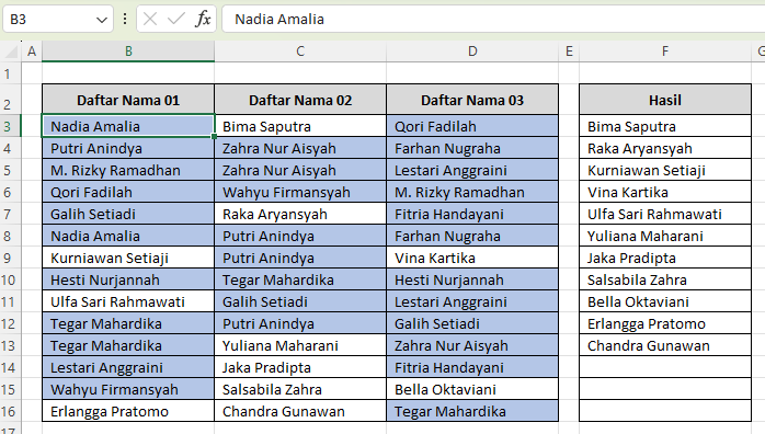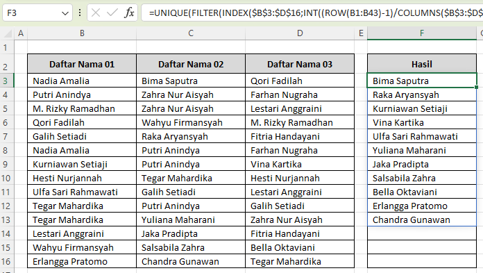Di ketiga daftar ini terdapat banyak nama yang sama, sehingga kita membutuhkan cara mengambil data unik untuk memastikan hanya nama yang muncul sekali saja yang ditampilkan di kolom hasil.