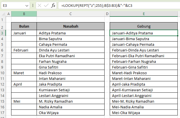 2. Hasilnya, Anda akan mendapatkan kombinasi bulan dan nama nasabah dalam satu kolom.