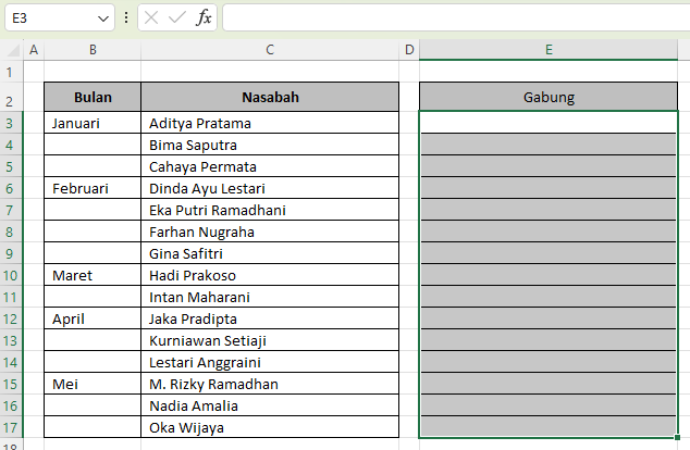 1. Buat tabel sederhana dengan kolom Bulan (B), Nasabah (C), dan kolom Gabung (E).