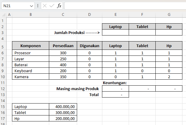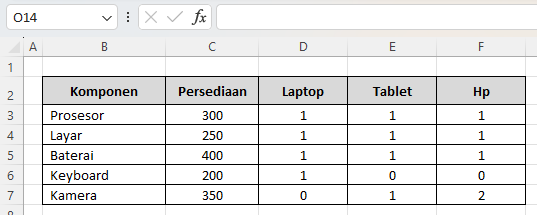 Pastikan kamu menyisakan ruang kosong di bagian atas untuk jumlah produksi, misalnya di sel E4 untuk Laptop, F4 untuk Tablet, dan G4 untuk HP.