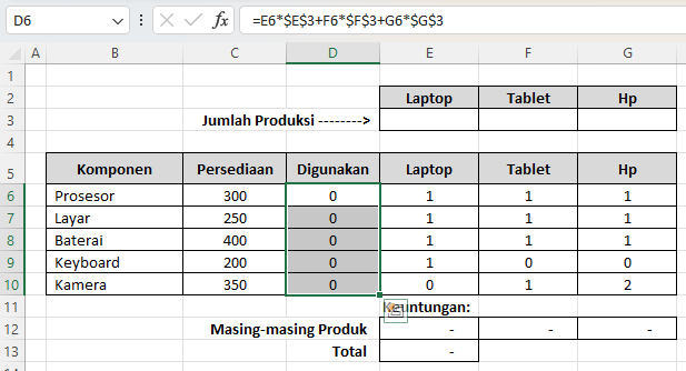 Rumus ini menghitung berapa banyak masing-masing komponen digunakan untuk memenuhi total produksi.