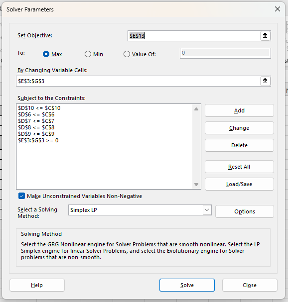 2. Pilih Solving Method → Simplex LP, karena ini masalah linear programming.
