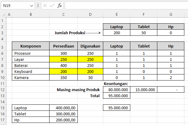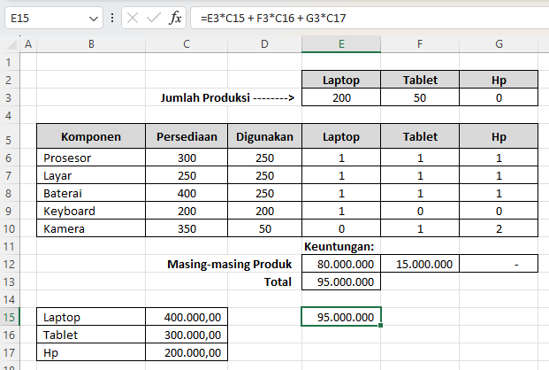 Artinya, untuk memaksimalkan keuntungan, perusahaan sebaiknya hanya memproduksi Laptop dan Tablet, karena memproduksi HP justru akan mengurangi efisiensi penggunaan komponen.