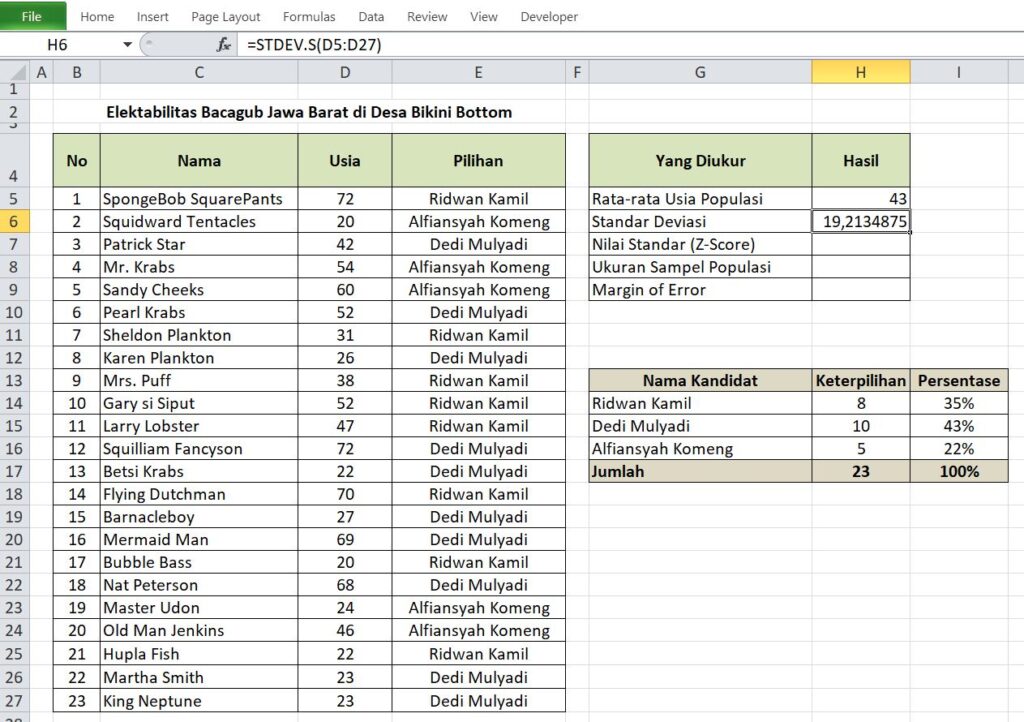 untuk mendapatkan standar deviasi dari data tersebut. - Untuk lebih jelas tentang cara menghitung standar deviasi di Excel beserta penjelasan lengkapnya bisa dibaca di sini.
