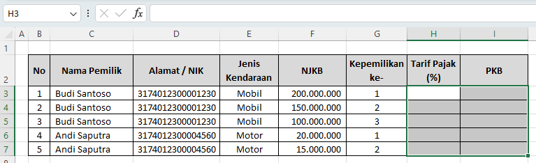 Buat kolom seperti contoh: Nama Pemilik, NIK, Jenis Kendaraan, NJKB, Kepemilikan ke-, Tarif Pajak, dan PKB.