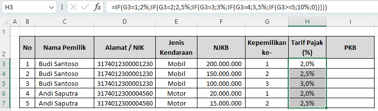 • IF(G3=1;2%;...) → Jika kendaraan pertama, tarif pajak = 2%.