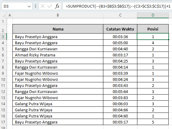 Bagian ini membandingkan catatan waktu peserta pada baris tertentu dengan seluruh catatan waktu yang lain. Jika catatan waktu lebih besar (lebih lama), hasilnya TRUE (1), jika tidak maka FALSE (0). - SUMPRODUCT(…)