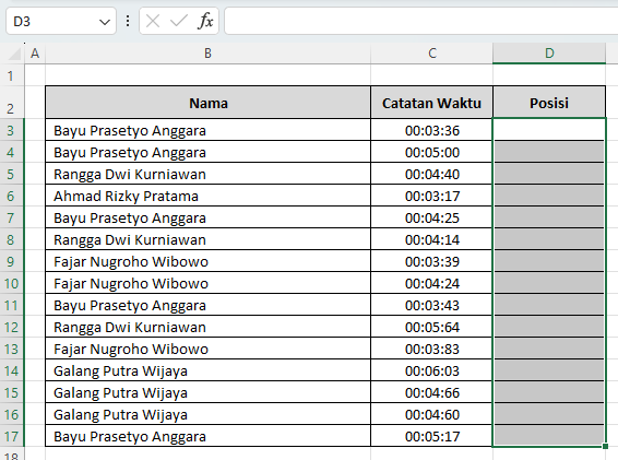 Kolom Nama berisi peserta, Catatan Waktu berisi rekor waktu pribadi mereka, dan kolom Posisi menampilkan ranking otomatis.