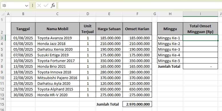 Berikut adalah contoh data omset harian penjualan mobil yang dicatat setiap tanggal di bulan Agustus 2025, dan Di sisi kanan tabel, kita ingin menambahkan kolom rekap minggua. Berikut contoh tabelnya: