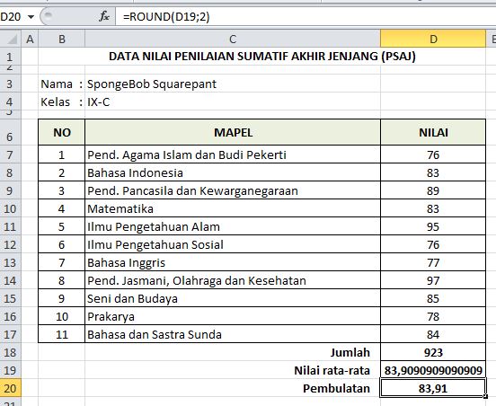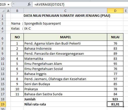 Masi menggunakan tabel yang sama, sekarang kita akan menghitung nilai rata-rata di atas. Di sel D19 tinggal masukkan fungsi AVERAGE berikut: