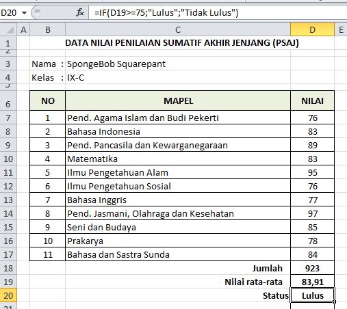 Dari data nilai di atas, misalnya syarat kelulusan adalah nilai rata-ratanya harus 75 ke atas. Jika nilai rata-ratanya kurang dari 75 maka otomatis akan dinyatakan “tidak lulus”. Maka fungsi IF yang digunakan adalah sebagai berikut:
