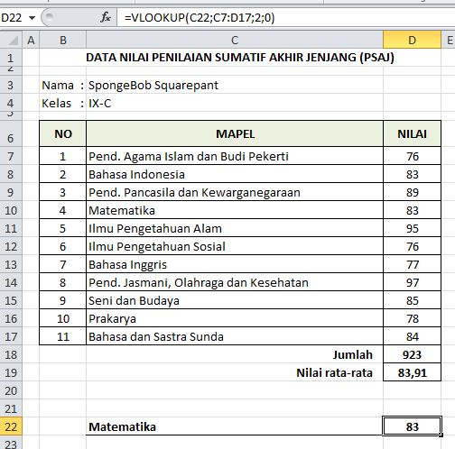 Jika kita ingin mengambil data nilai Matematika seperti pada contoh di atas maka fungsi atau formula yang harus diinput adalah sebagai berikut: