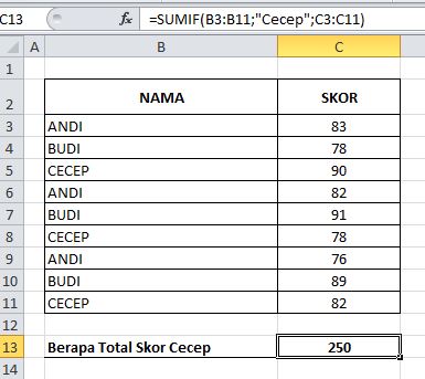 =SUMIF(B3:B11;”Cecep”;C3:C11)