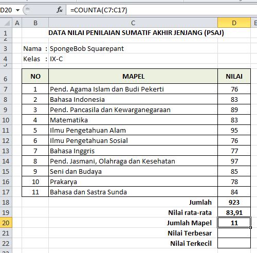 Jika kita membutuhkan total jumlah nilai seperti pada contoh tabel di atas, maka yang perlu dilakukan hanyalah menambahkan fungsi SUM berikut di sel D18: