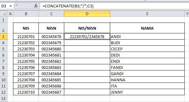 Untuk menggabung dua data dari dua sel dengan separator pemisah “/” maka fungsi Excel di sel D3 yang digunakan adalah sebagai berikut: