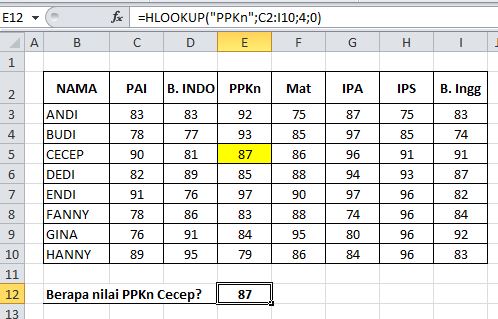 Untuk sederhananya, jika kita ingin mencari nilai PPKn Cecep artinya kita harus mengambil data di baris ke-4 di kolom PPKn. Fungsi yang bisa digunakan adalah sebagai berikut: