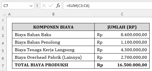 Total Biaya Produksi = Biaya Bahan Baku + Biaya Tenaga Kerja + Biaya Overhead Pabrik