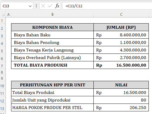 Langkah selanjutnya adalah membagi HPP Total dengan jumlah unit yang dihasilkan.