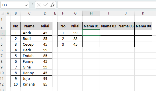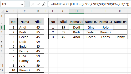 - TRANSPOSE(…) → mengubah hasil FILTER yang biasanya vertikal menjadi horizontal, sehingga nama siswa tersusun di baris yang sama (Nama 01, Nama 02, Nama 03, dst).