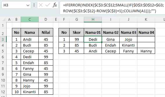 Memilih hasil terkecil ke-1, ke-2, ke-3, dst sesuai posisi kolom. Jadi di kolom pertama akan muncul nama pertama, di kolom kedua nama kedua, dan seterusnya. - INDEX($C$3:$C$12, …)