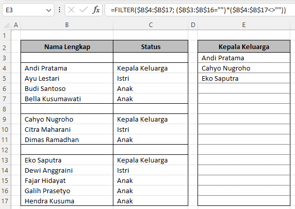 Mengambil hanya data yang memenuhi syarat tersebut. Hasilnya langsung berupa daftar nama kepala keluarga tanpa perlu menarik rumus ke bawah.