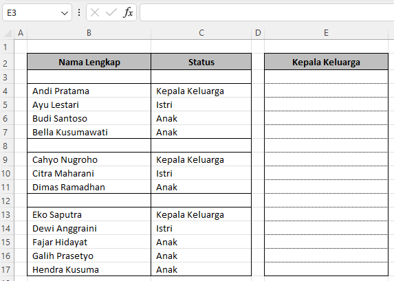 Pada kolom Kepala Keluarga, kita hanya ingin menampilkan nama pertama setelah baris kosong di atasnya. Inilah tujuan utama penggunaan rumus mengambil data setelah sel kosong.