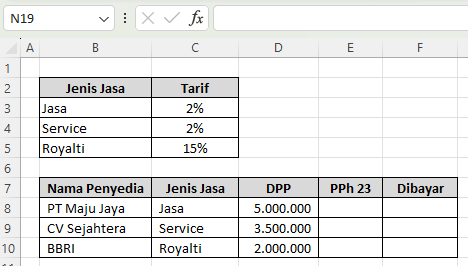 Tabel seperti ini sangat ideal untuk diterapkan dalam Excel dan menjadi dasar utama cara menghitung PPh 23 di Excel.